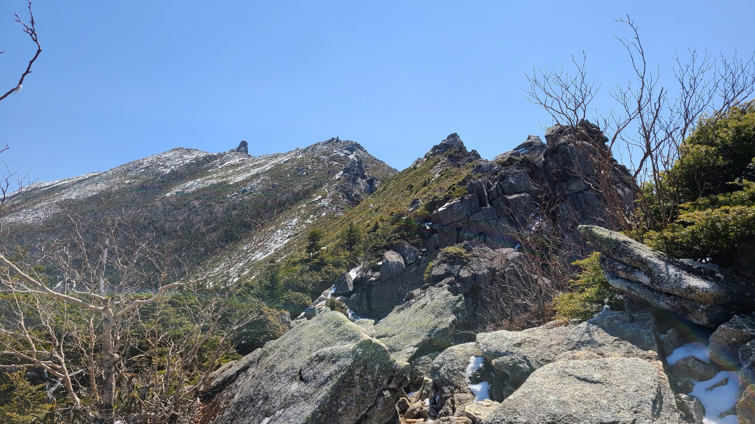 登り始めて約20分ほどで眺望が一度開けて、瑞牆山山頂の黒雲母花崗岩で構成された尖峰が連なる見えるスポットに♪