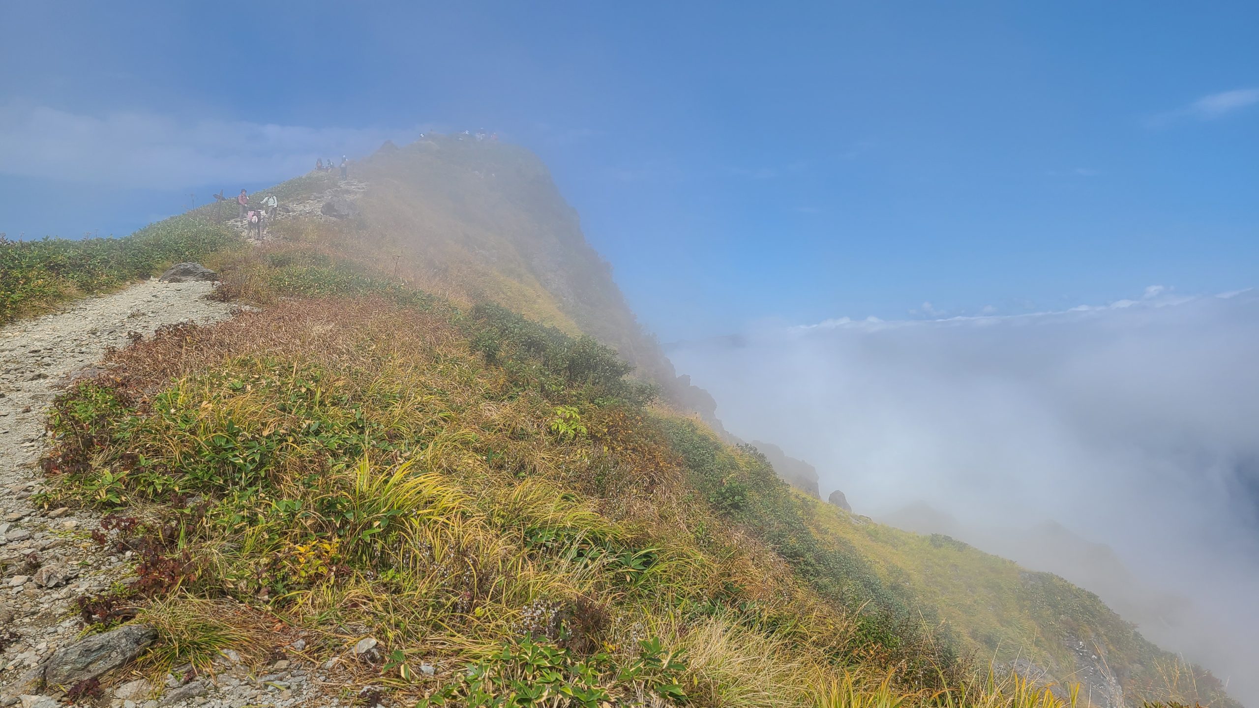 岩稜帯に出ると風が強く、ガスも多めで時折真っ白でした。