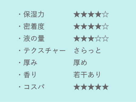 角質層が水分で満たされている感じにちょうど良く潤うので、朝のメイク前にも使用しやすいかなと思いました。
