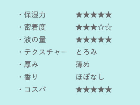かなりしっとりとした使用感で、肌がちょっとペタっとするくらいの保湿力で、パック後にクリームで蓋をしなくてもいいくらいしっとりしていてもっちりとした仕上がりです♪